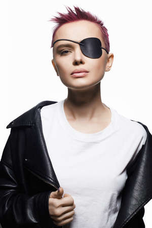 beautiful woman with eye patch and short pink hair. portrait of beauty young woman in leather. Trendy coloring Hairstyle
