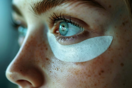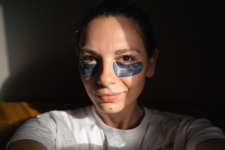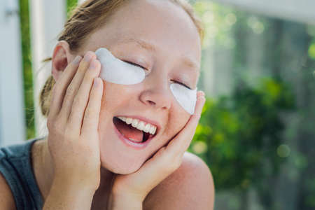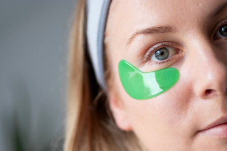 Close up of a caucasian millennial woman with no makeup and green gel moisturizing patches under her eyes
