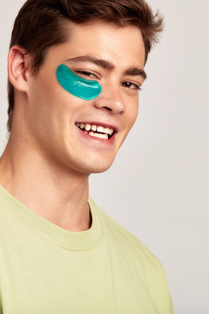 Close up portrait of a young handsome smiling guy having cosmetic under eye hydrogel patch on his face. Brown haired caucasian man practices skin care routine to keep healthy and youthful looking.