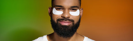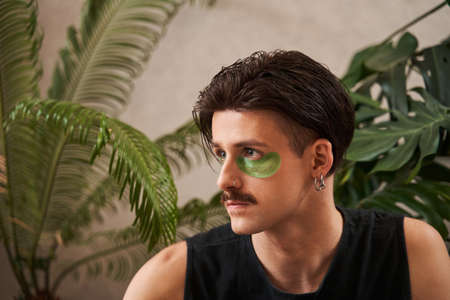 Portrait of tattooed young man using moisturizing face patches while enjoying evening skincare routine for males, copy space