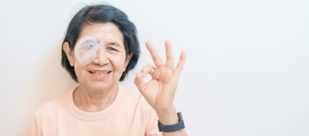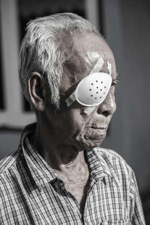 Elderly Woman with eye protective shield after eye surgery. Eye disease, Cataract, Glaucoma, Age Related Macular Degeneration, Diabetic Retinopathy, Vitreous, Lasik, World Glaucoma day and health