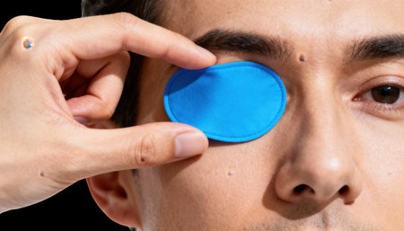 Caregivers hands demonstrating proper placement of a vibrant eye patch on an adult models stronger eye isolated on white for effective amblyopia occlusion therapy training.