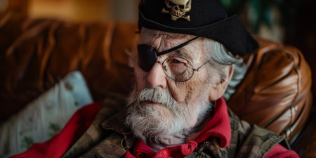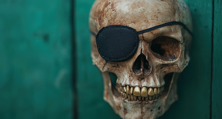 Portrait of a tough looking pirate wearing an eye patch and tricorn hat, posing against a dark background, conveying a sense of adventure and danger