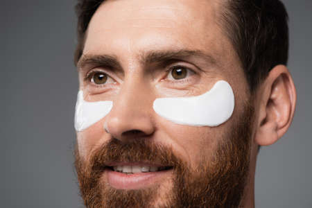 close up view of cheerful bearded man with moisturizing eye patches isolated on grey