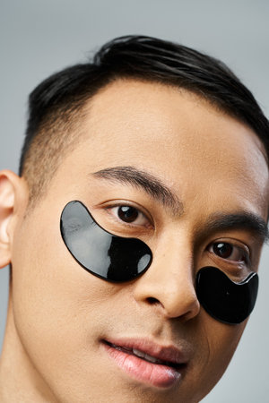 Handsome Asian man with under eye patches during beauty and skincare routine in grey studio.
