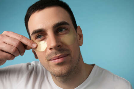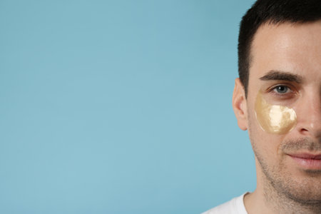 Man applying golden under eye patch on light blue background. Space for text