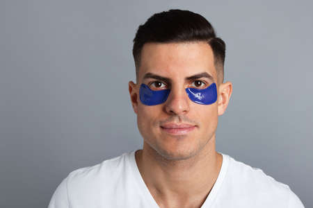 Man with blue under eye patches on gray background