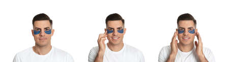 Collage of handsome man with cosmetic under eye patches on white background. banner design