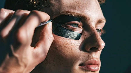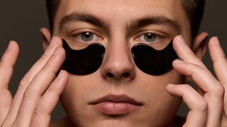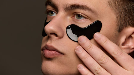 A young man applies black hydrogel patches to his eyes, illuminated by ambient light, highlighting his daily skin care routine. Soft masculinity, daily self-care, mens cosmetology