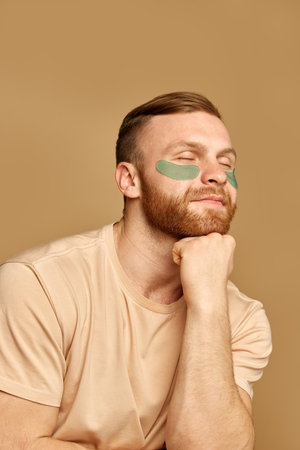 Close up portrait of young attractive man sitting with hydrogel patches under the eyes against swelling and bruising against beige background.