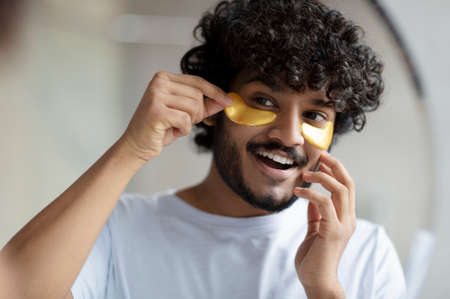 Skin care to reduce eye bags. Cheerful indian man applying gold anti-fatigue patches under eyes, looking at mirror