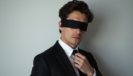 A stylish man in a sleek black suit stands confidently, his eyes covered by a black blindfold, exuding an air of mystery and intrigue. The contrast of his formal attire against the minimalist background creates a striking visual, inviting viewers to ponder the story behind his enigmatic expression.