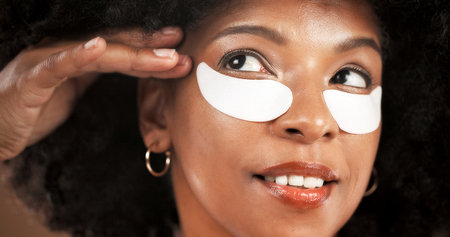 Eye mask, beauty and face of black woman in studio for dark circles, hydration and wellness. Dermatology, happy and African person with pads for collagen, anti aging or facial health on background