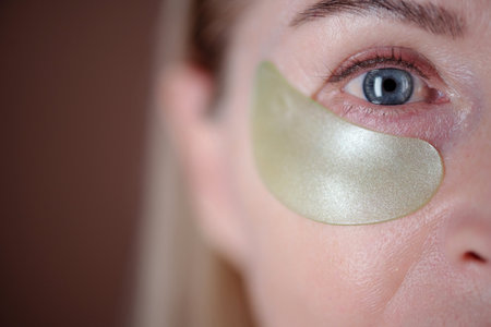 Close-up selective focus shot of eye of middle-aged woman looking at camera having hydrogel patch highlighting skincare routine and treatment