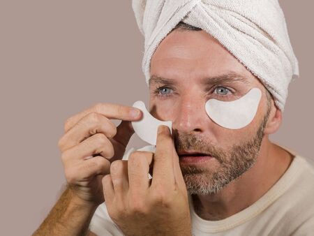funny isolated face portrait of young happy and attractive camp gay man applying moisturizer eye patch facial product with head wrapped towel in masculine skincare and soft beauty concept