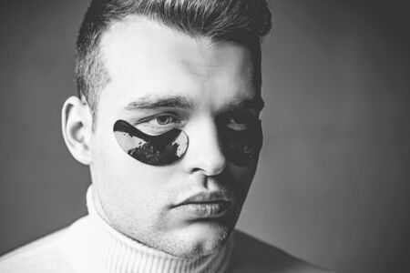 Man with black eye patches close up face. Beauty treatment. Skin care. Metrosexual concept. Focused treatments for under eye area. Minimizes puffiness and reduce dark circles. Eye patches for men