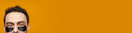 Banner crop of adult man with hydrogel eye patches touching skin isolated on grey background
