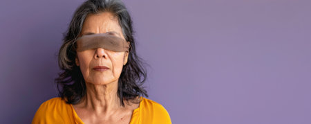 Portrait of a middle-aged Latina woman with a blindfold, standing against a serene purple background with plenty of copy space.ai generated