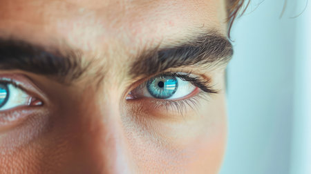Close up view of person eyes, showcasing striking blue irises and well defined eyebrows. skin appears smooth and radiant, highlighting natural beauty and detail of eyes