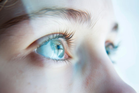 Captivating close-up of a human eye featuring a stunning blue iris, long lashes, and a natural brow, illuminated by soft light that enhances the intricate details of the eye and its expression.