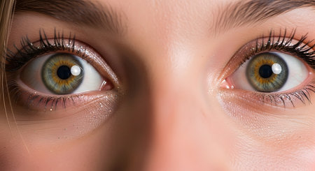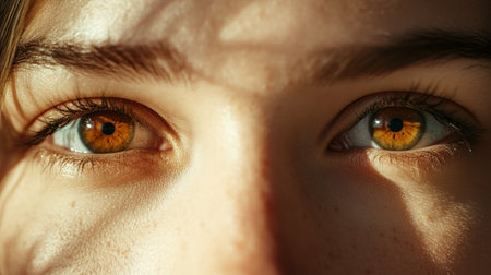 Female caucasian eyes with striking amber irises, accentuated by natural light and gentle shadows. symmetrical eyebrows and delicate eyelashes frame the expressive gaze, highlighting the skin's texture and subtle freckles.