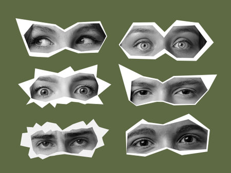 Different expressions of surprise and curiosity shown through various eyes on a textured green background
