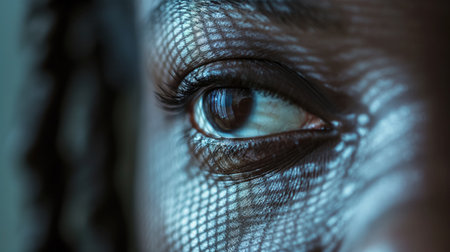 An eye with patterned shadows across the face creating a dramatic and artistic visual effect.