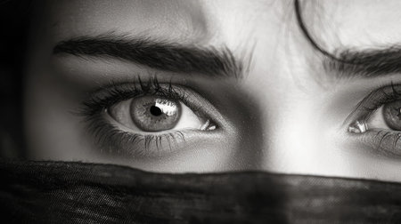This striking black and white photo features a close-up of a woman's eyes partially obscured by a dark veil, conveying deep emotion and mystery.