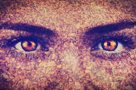 Amber eyes and dark eyebrows are glowing over fallen leaves in digital double-exposure flat design. Mystery, surreal, warm tones, nature, artistry, contemplative, textured