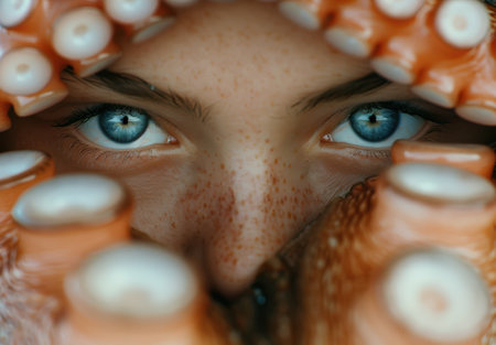 Close up portrait of person with striking green eyes, illuminated by soft natural light. Shadows create dramatic effect face, highlighting skin texture and features. expression conveys sense