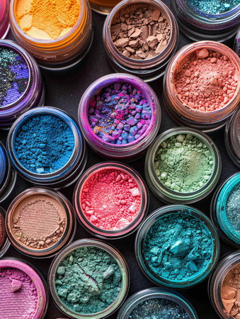 A close-up shot of various colorful makeup pigments and powders in small jars, arranged in a visually appealing pattern.