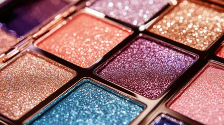 Captivating close-up image of a vibrant eyeshadow palette featuring an array of shimmering and glittering shades perfect for makeup artists and beauty lovers.