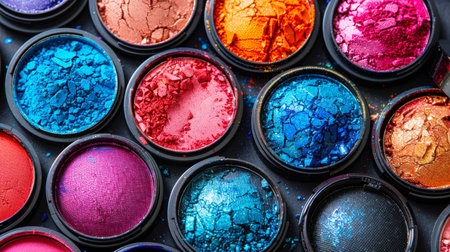 A detailed close-up of vibrant powdered cosmetics in an array of shades, artfully arranged to showcase different textures and colors