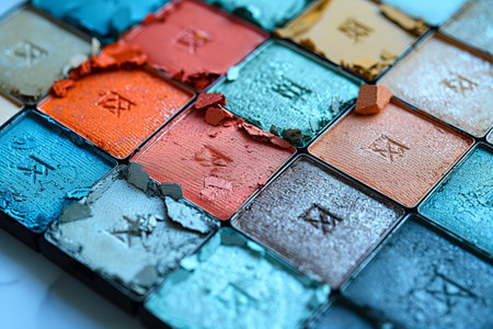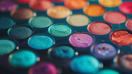 Closeup of a vibrant and artistic eyeshadow palette with a variety of colorful shades, perfect for creating trendy and glamorous makeup looks