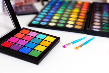 Palette of colorful eye shadows with brushes on white horizontal background. Close up with multicolored palettes for visagistes, copy space.