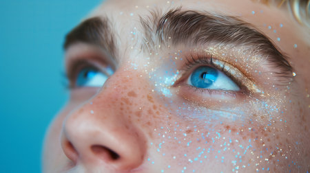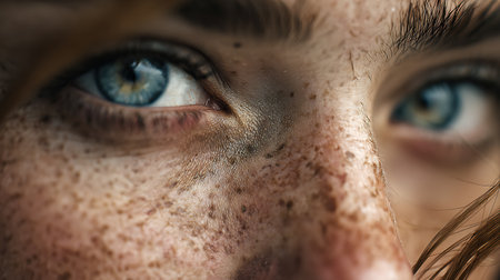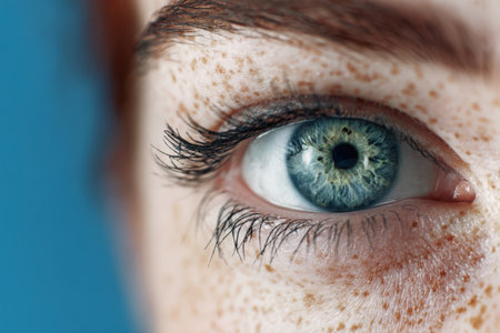 Detailed close-up of blue eye with freckles, highlighting vibrant colors and textures against a soft blue background, capturing natural beauty and individuality