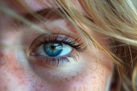 Macro shot capturing the detailed beauty of a womans blue eye with strands of her hair tousled by the wind