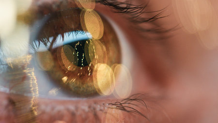 A close view of a human eye augmented with a digital overlay showcasing enhanced vision features such as augmented reality notifications and health indicators..