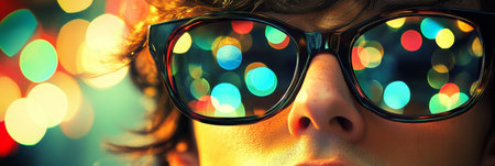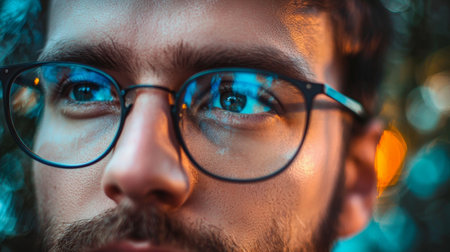 An artistic close-up of a man's face wearing glasses, with reflections of vibrant lights, creating a modern and visually intriguing composition.