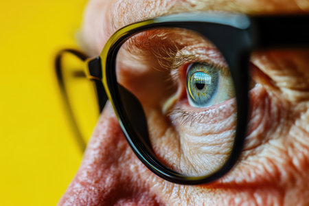Close-up of a man eye with glasses on a solid bright background, highlighting vision, care, and eye health.