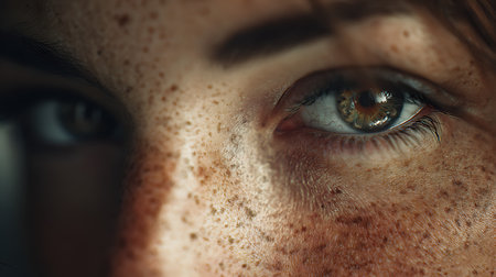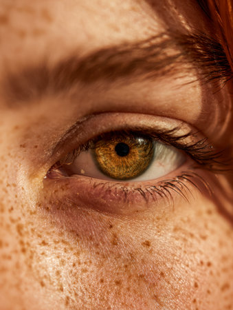 A close-up of a captivating amber-hued eye, framed by delicate eyelashes and speckled skin dotted with freckles, bathed in soft, golden natural light.