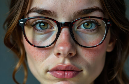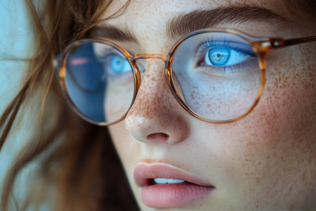 A closeup shot of a person wearing glasses with a reflection of another person in the lenses, showcasing the importance of vision care and eye glass accessories AIG50