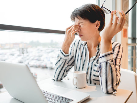 Working woman feeling tired, rubbing eyes after using laptop, having fatigue, sitting in cafe with coffee