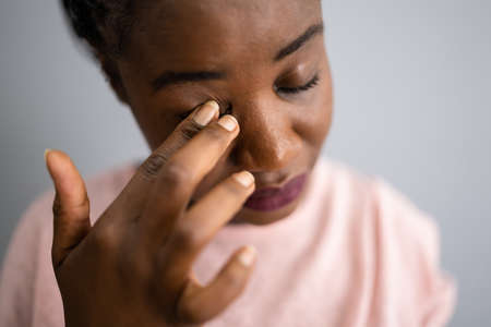 Front view portrait of a man with black skin scratching itchy eyes in a park