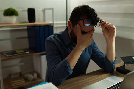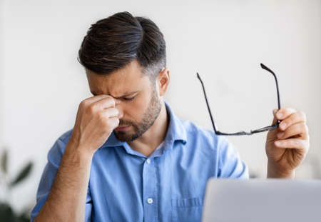 Suffering from eyesight problem after working with computer. Tired man massages eyes after working on laptop