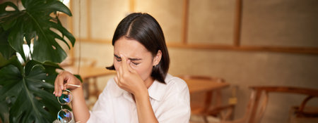 Fatigue, overworking, modern tech usage, blurry vision, dry eyes need drops concept. Close up of young tired woman takes off glasses rubs nose bridge reduces eyestrain feels discomfort and exhaustion