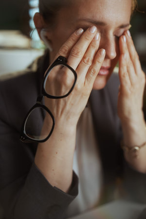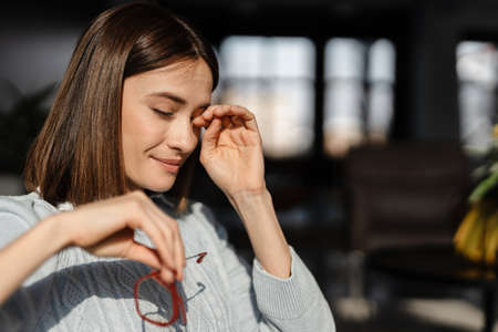 Tired businesswoman holding eyeglasses and massaging nose bridge. Young woman experiences discomfort from long wearing glasses. Close up view. Bad eye vision concept