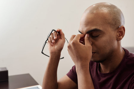Stressed tired bald Black man taking off glasses and rubbing nose bridge