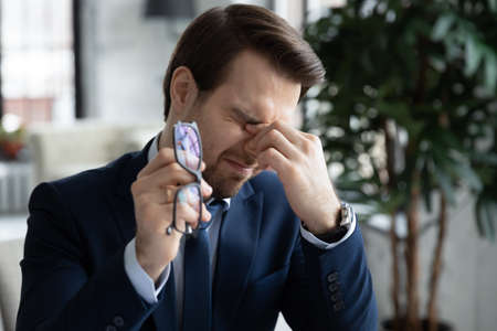 Exhausted male employee take off glasses massage eyes suffer from blurry vision or dizziness, tired businessman feel fatigue suffer from migraine or headache, overwork, eyesight problem concept