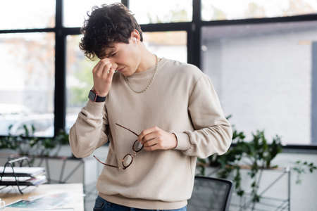 Frustrated young man massaging his nose and keeping eyes closed while sitting at his working place in office